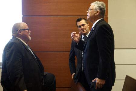 Sitting in the gallery, Peterson shook his head and grunted in disagreement during Brill’s argument. The parents of two students who were killed, 15-year-old Luke Hoyer and 18-year-old Meadow Pollack, sat down just feet behind Peterson, who later moved to the other side of the courtroom before leaving.
